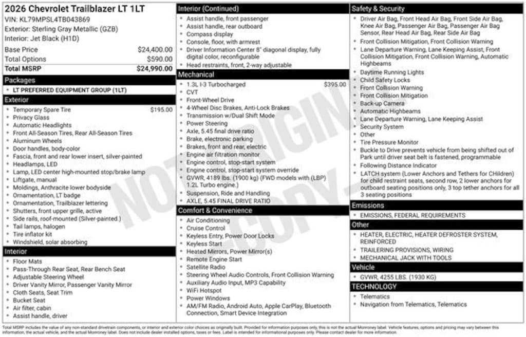 You'll appreciate its safety and convenience features! A turbocharger further enhances performance, while also preserving fuel economy. Chevrolet prioritized fit and finish as evidenced by: power door mirrors, rear wipers, and a split folding rear seat. It features an automatic transmission, front-wheel drive, and an efficient 3 cylinder engine.