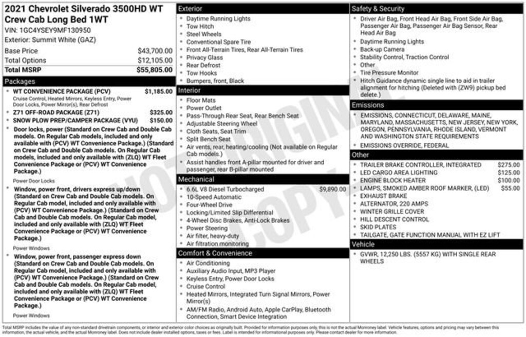 Recent Arrival in Millersburg!! 4x4. Turbo Diesel 6.6L Engine. Cruise Control. Power Locks. Power Mirrors. Z71 Off Road Package. Trailer Brake Control. The 2021 Chevrolet Silverado 3500HD WT (Work Truck) with the 6.6L Duramax turbo-diesel engine and Crew Cab configuration is a heavy-duty pickup designed for maximum towing and hauling capability, featuring a powerful 445 hp, 910 lb-ft torque engine paired with a 10-speed Allison automatic transmission. As the Work Truck model, it offers a 7-inch color touchscreen, a 6-speaker audio system, Bluetooth, Apple CarPlay, and Android Auto, with features like a backup camera, integrated BedStep, and sturdy fixed cargo tie-downs.