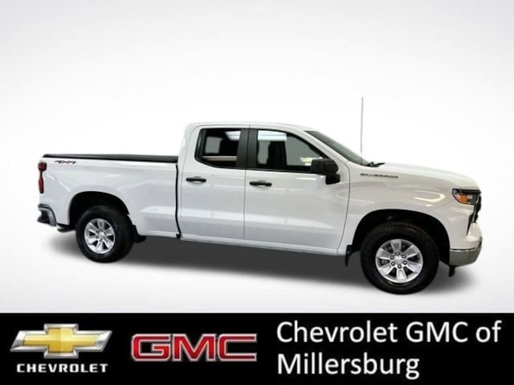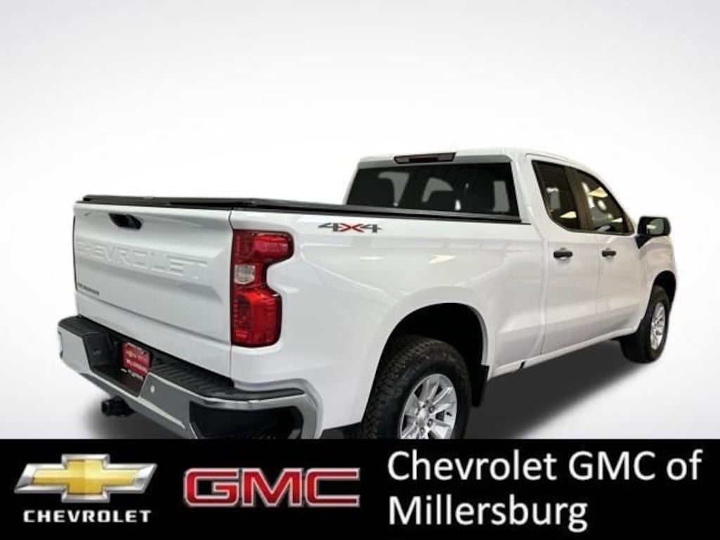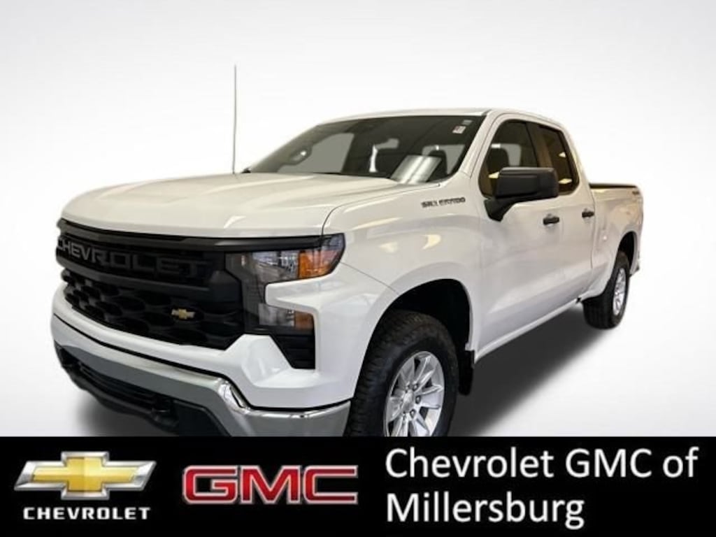 The 2023 Chevrolet Silverado 1500 WT 4WD Double Cab is powered by a 5.3L EcoTec3 V8 engine paired with a 10-speed automatic transmission and finished in Summit White with a Black cloth interior. It includes the Preferred Equipment Group 1WT, WT Convenience Package, WT Value Package, Standard Suspension Package, and Trailering Package, offering both durability and utility. Inside, features include air conditioning, Chevrolet Infotainment 3 system with a 7-inch touchscreen, Apple CarPlay/Android Auto, Bluetooth, 6-speaker audio system, HD rear vision camera, lane keep assist with lane departure warning, forward collision alert, automatic emergency braking, and a 3.5-inch driver information display. The truck also has power windows, remote keyless entry, tilt steering wheel, trip computer, rubberized-vinyl floor covering, and 40/20/40 front split-bench seat with a rear 60/40 folding bench. Safety features include ABS, 4-wheel disc brakes, dual front and side-impact airbags, and stability control. Exterior highlights feature black front and rear bumpers, chrome front bumper, heated power-adjustable mirrors, rear step bumper, 17-inch bright silver painted aluminum wheels, deep-tinted glass, Chevytec spray-on bedliner, and front frame-mounted recovery hooks. With its 3.42 rear axle ratio and integrated trailer brake controller, this Silverado combines capability, safety, and practicality for both work and everyday use.