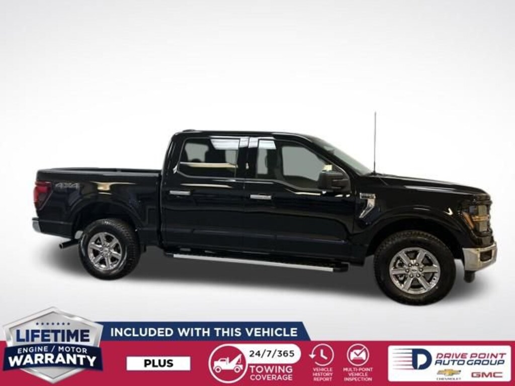 The 2025 Ford F-150 XLT 4WD SuperCrew comes in Black Metallic with a Black/Medium Dark Slate cloth interior and runs on a 3.5 L EcoBoost V6 paired to a 10-speed automatic. Itâs equipped with Equipment Group 301A Standard, AM/FM stereo with SiriusXM 360L and six speakers, SYNC 4 with Enhanced Voice Recognition, dual-zone electronic automatic temperature control, rear window defroster, power windows, power steering, remote keyless entry, and steering-wheel audio controls. Safety features include 4-wheel disc brakes, ABS, traction control, brake assist, electronic stability control, dual front and side-impact airbags, emergency communication system (SYNC 4 911 Assist), overhead airbag, front anti-roll bar, front independent suspension, low tire-pressure warning, rear parking sensors, panic alarm, security system, and speed control. Exterior highlights include chrome front and rear bumpers, 6-inch angular bright anodized step bars, black painted grille with chrome center bar, heated power door mirrors, rear step bumper, chrome single-tip exhaust, auto high-beam headlights, front fog lights, fully automatic headlights, and variably intermittent wipers riding on 18-inch Chrome-Like PVD alloy wheels with a 3.31 axle ratio. It has passed a 120-point inspection, includes two sets of keys, and is a one-owner non-smoker vehicle with service records available.