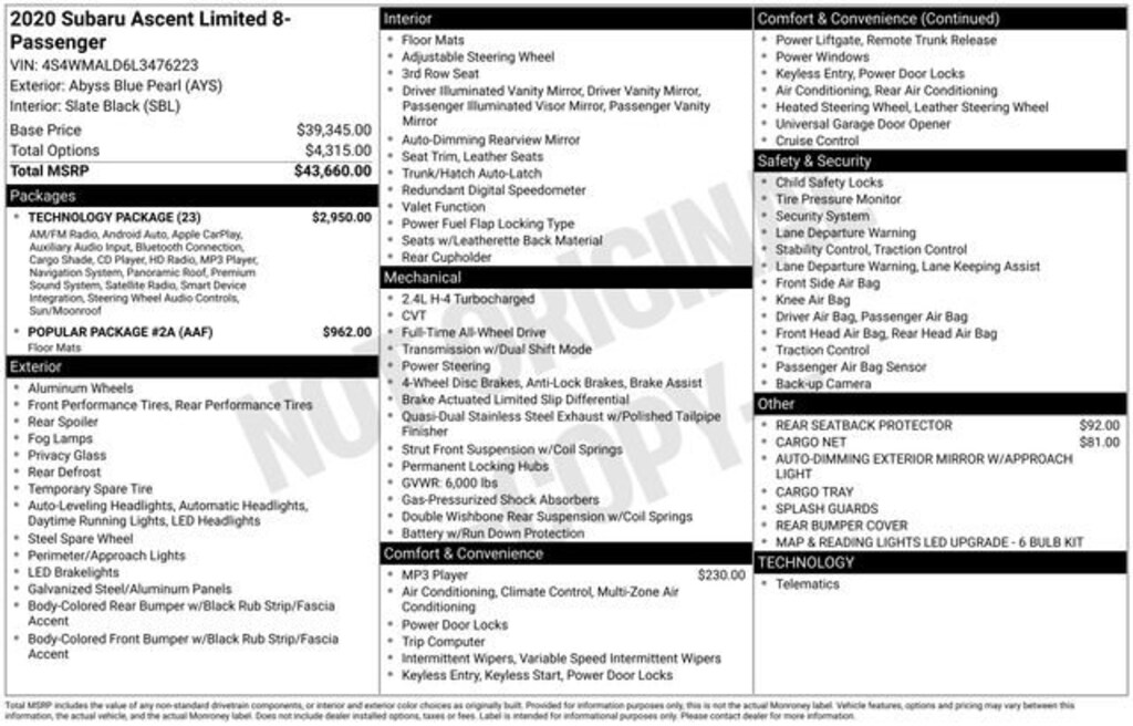 So far... so good... reflections about my nearly 1-year old 2020 Subaru Ascent Touring. I spent 2 years exploring the 3-row cross-over market segment and finally ended up where I started my search and that was with the purchase of the Ascent Touring. In my humble opinion, the Ascent offered everything I wanted, nothing I didn't want, and zero compromises versus its competition. When all was said and done, I walked out of the dealership with 0% APR and the total price paid including tags and taxes = $41,500; which I felt and still feel was a wonderful price and value.